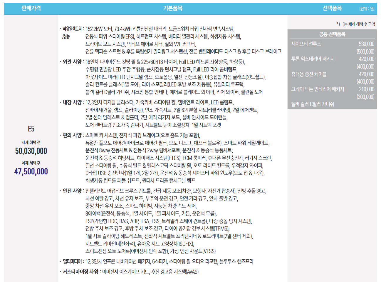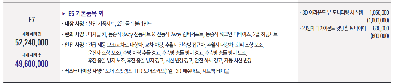 E5 등급도 웬만한 편의 사양이 적용되어 있어서 가성비 모델로 구매해도 좋을 것 같습니다. E7 등급 선택 시 E5의 기본사양이 모두 적용되고 디지털키, 전동시트, 2열 열선 시트와 안전 사양이 좀 더 추가되는 것으로 보입니다.