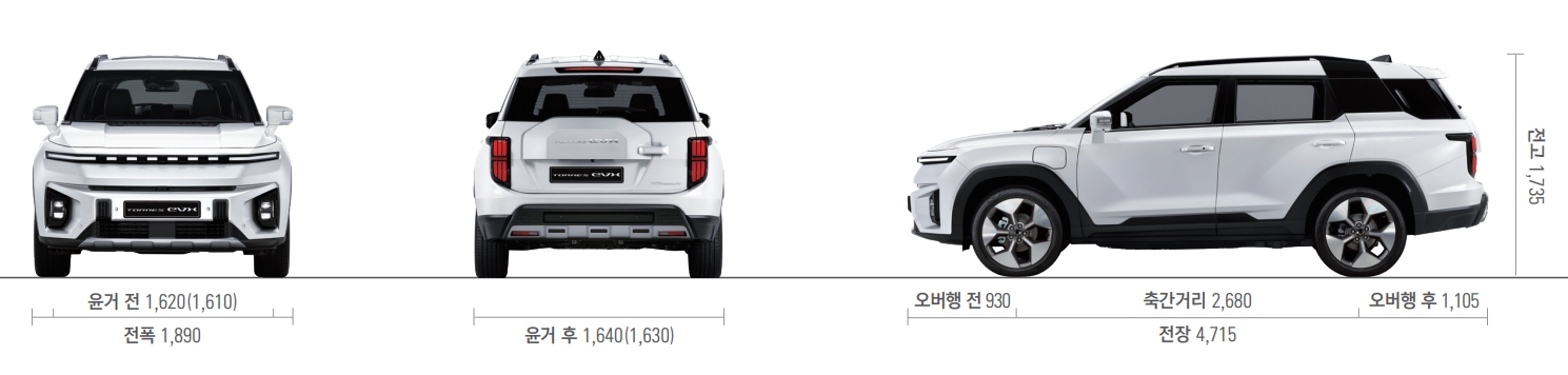 토레스 EVX의 제원은 전폭이 1,890mm, 전장이 4,715mm, 전고가 1,715mm, 축간거리 2,680mm로 기아자동차의 스포티지(전폭 1,865mm, 전장 4,660mm, 전고 1,660mm, 축간거리 2,755mm) 보다 조금 큰 크기를 가지고 있습니다.