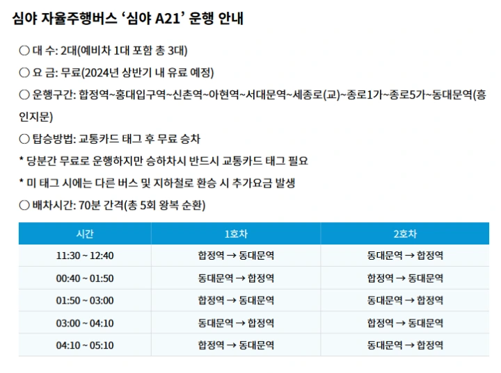 심야에 운행하는 자율주행 버스는 어제저녁 11시 30분부터 운행하였습니다. 이 버스의 노선번호는 '심야 A21'로 운행 시간은 평일 저녁 11시 30분부터 다음날 오전 5시 10분까지입니다. 운행 대수는 2대로 배차간격이 70분으로 긴 편입니다.